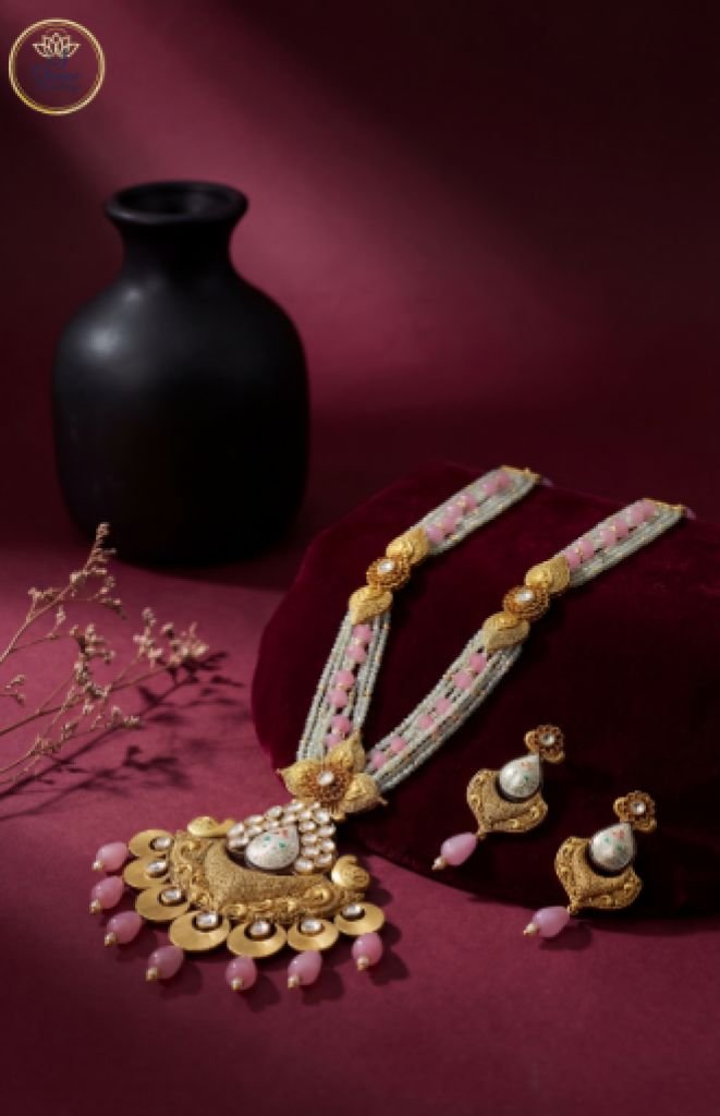 An elegant antique-style necklace set featuring pearl detailing, meenakari work, and soft pink bead drops with matching earrings.