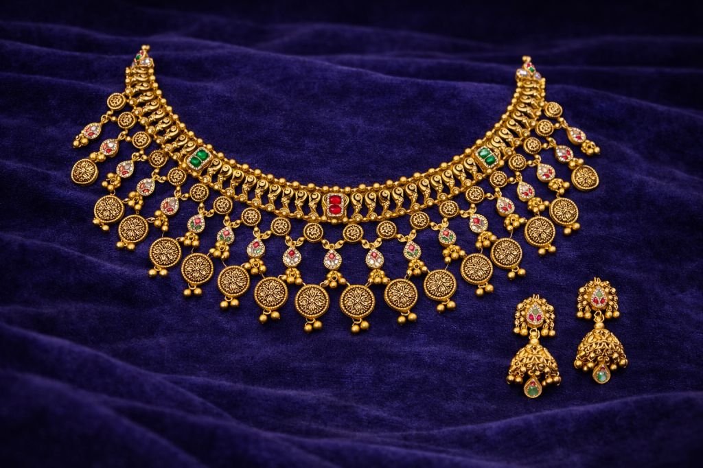 Divine Jewellery Antique Temple Coin Choker Necklace Set with Ruby Emerald Accents and Traditional Jhumka Earrings