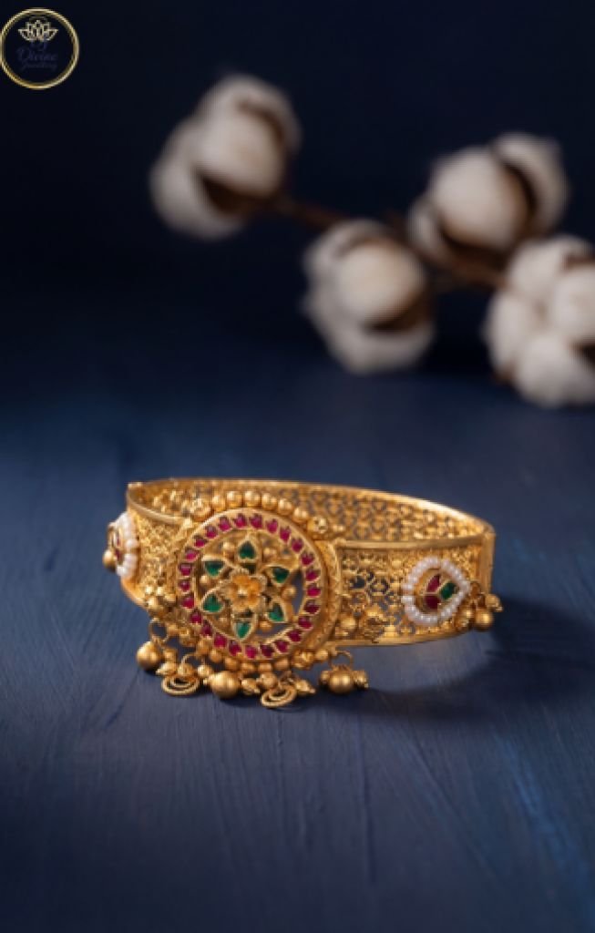 An elegant temple-style kada bracelet featuring intricate floral craftsmanship with ruby, emerald, and pearl accents.