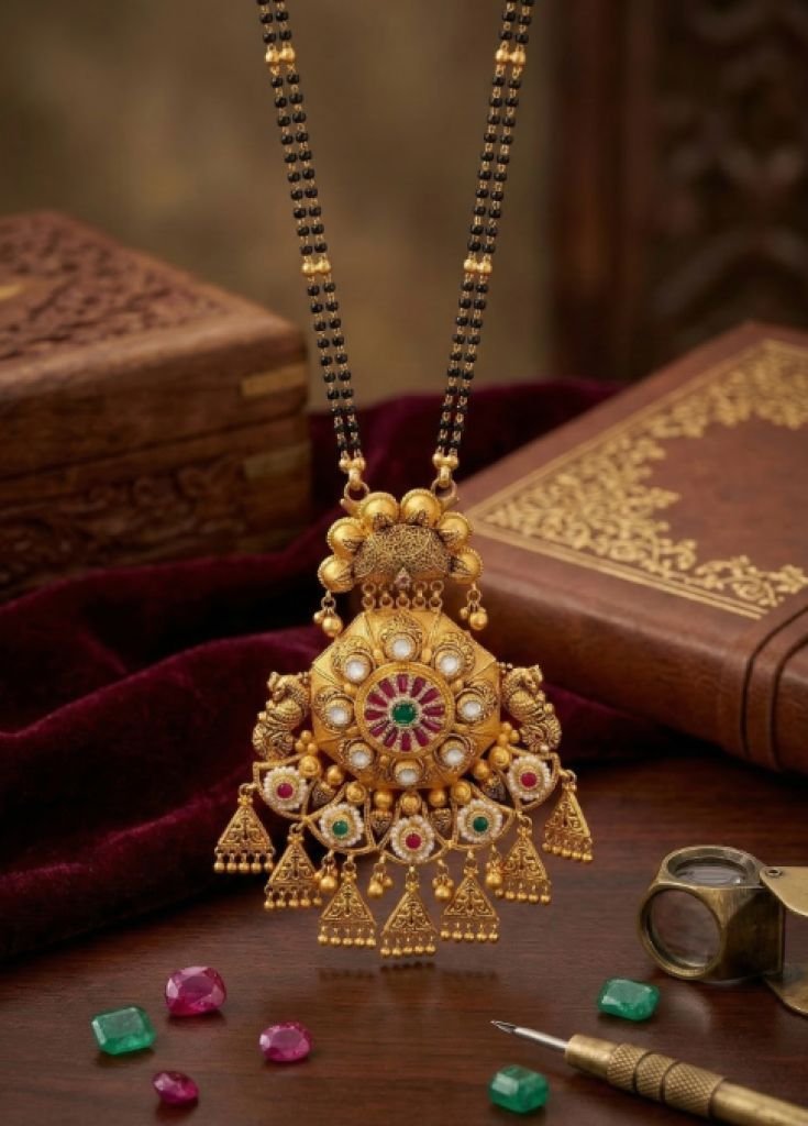 Traditional mangalsutra crafted in 92.5 silver with gold plating featuring an antique temple-style floral pendant with ruby emerald kundan accents and classic black bead chain.