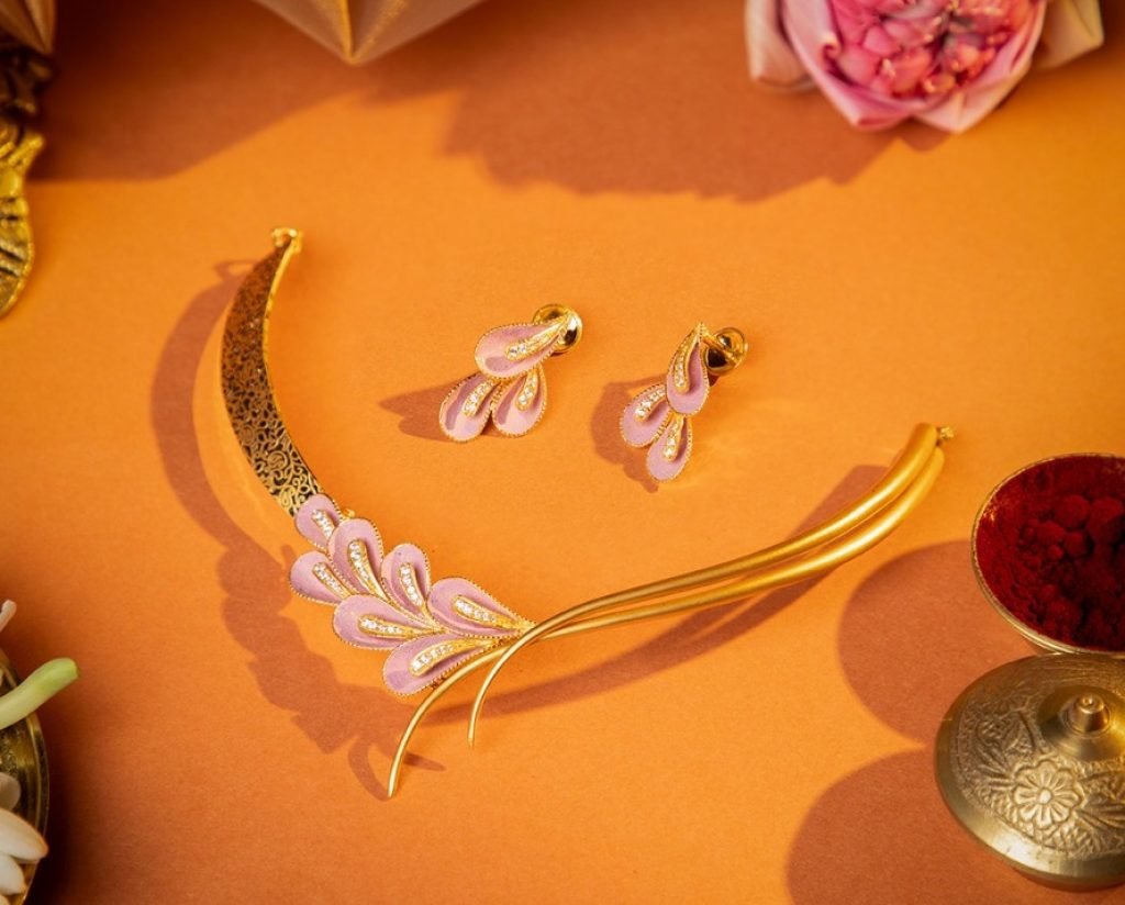 Elegant blush pink floral necklace set crafted in gold-plated 92.5 silver with crystal accents and matching earrings.