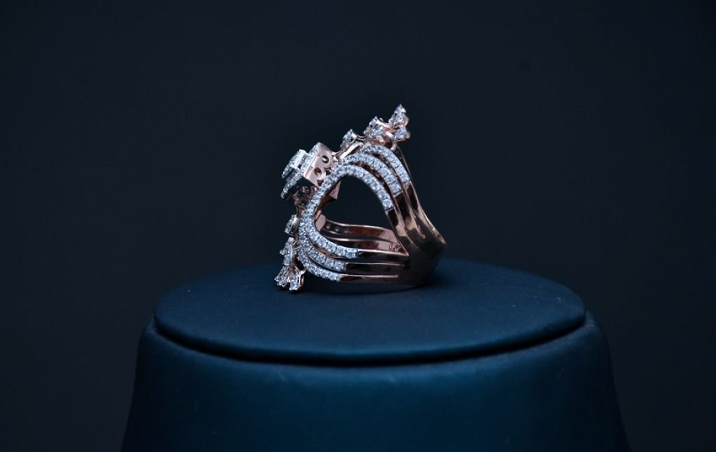 A sculptural multi-layer arc ring with cascading stone accents, crafted for bold luxury styling.