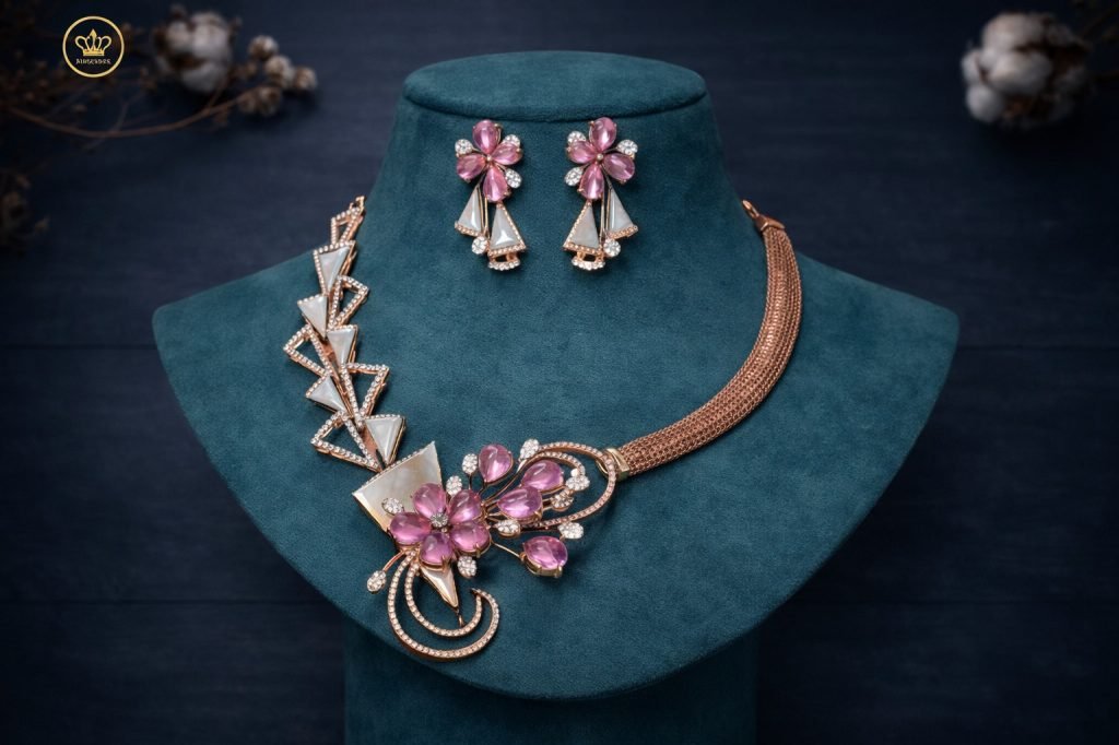 Stylish contemporary necklace set featuring pink floral stones, geometric mother-of-pearl elements, and matching designer earrings.