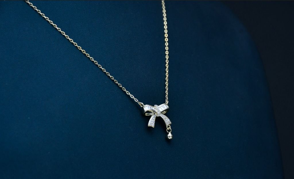 A delicate fine-chain necklace featuring a sparkling bow motif with a graceful drop charm.