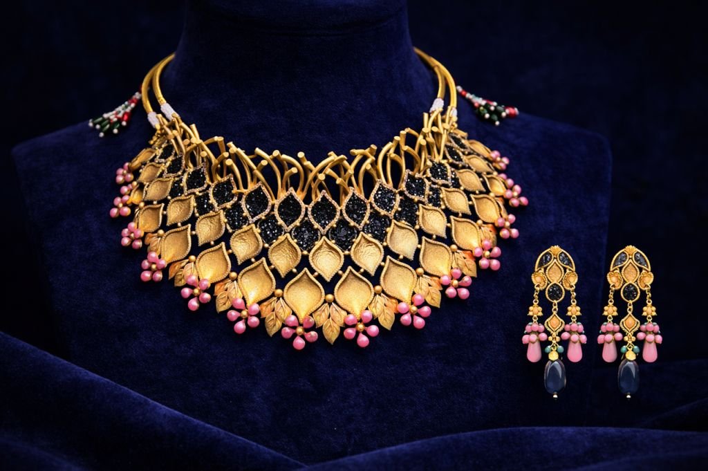 Bold designer choker with black stone detailing, gold leaf motifs and pink bead drops, paired with matching earrings.