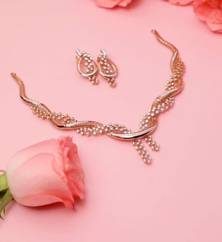 Elegant rose gold-plated 92.5 silver designer necklace set featuring a flowing wave pattern with sparkling crystals and cascading drop accents with matching earrings.