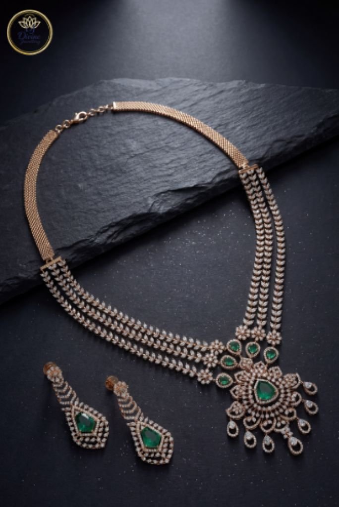 A luxurious bridal necklace set featuring sparkling diamond-style stones and elegant emerald green gemstone accents.