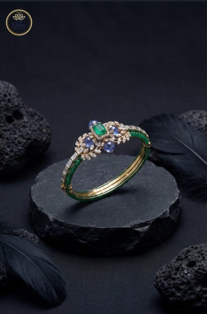 A luxurious dual-tone bracelet featuring emerald and sapphire accents with intricate diamond-style floral detailing.
