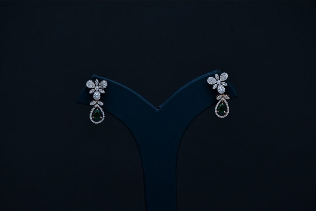 A delicate floral diamond-style necklace set featuring a graceful emerald teardrop pendant with matching drop earrings.