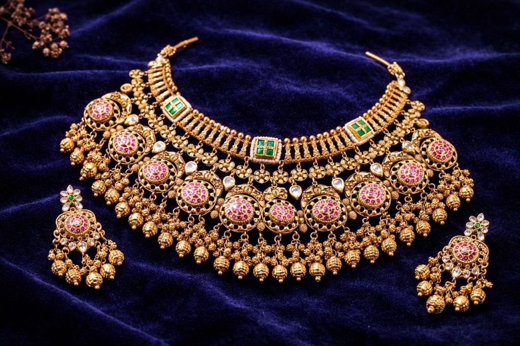 Heavy kundan bridal choker with layered drop design and matching statement earrings.
