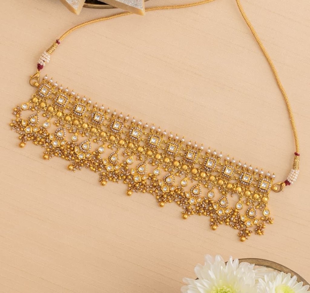 Elegant layered Kundan choker with pearl detailing and antique fringe drops, crafted in 92.5 silver with gold plating.
