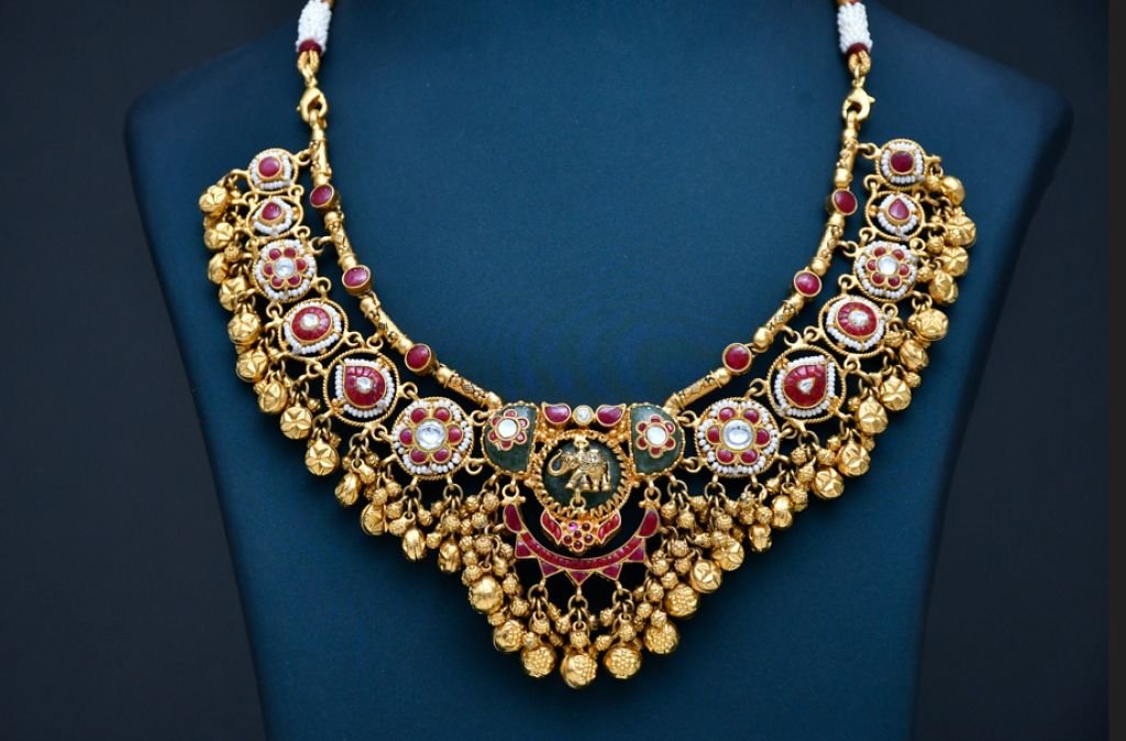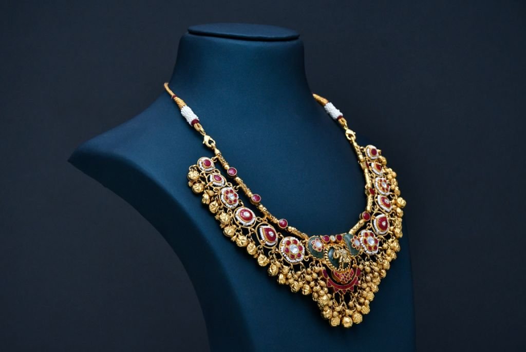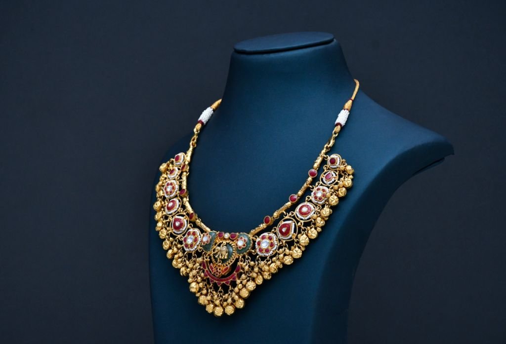 A sacred temple-inspired bridal necklace featuring Lakshmi motif, ruby detailing, and rich gold bead cascades.