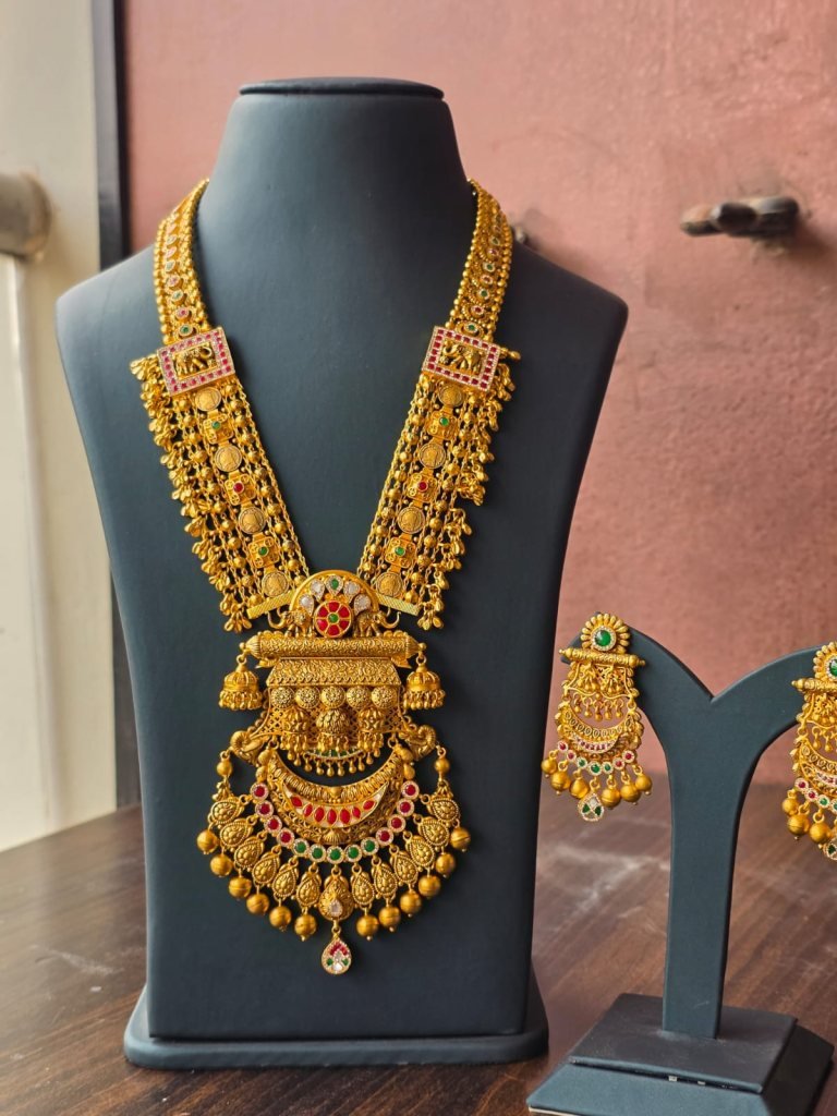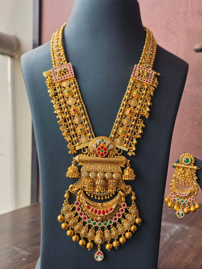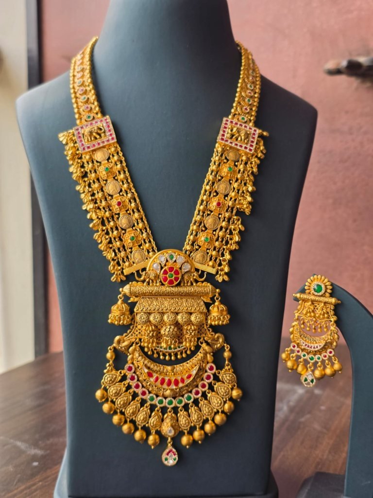 A grand temple-inspired bridal haram featuring coin layers, goddess motifs, and rich ruby-emerald accents.