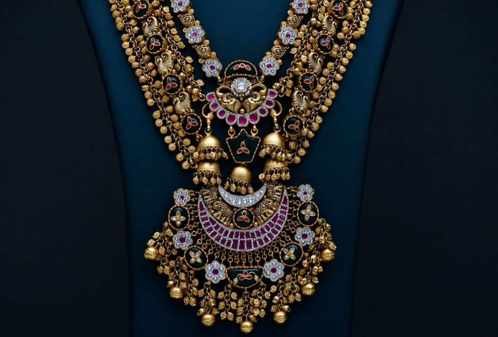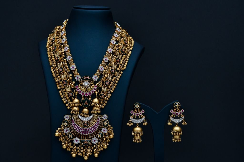 An opulent multi-layer temple necklace set featuring intricate motifs, traditional detailing, and majestic jhumka-style earrings.