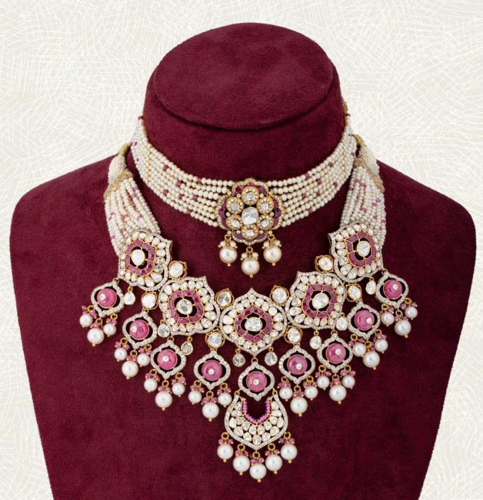 A luxurious bridal choker set featuring layered pearl strands, radiant polki stones, and ruby-toned accents with elegant pearl danglers.