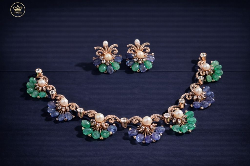 Divine Jewellery Pastel Floral Statement Necklace Set with Emerald Green, Sapphire Blue Stones and Pearl Accents