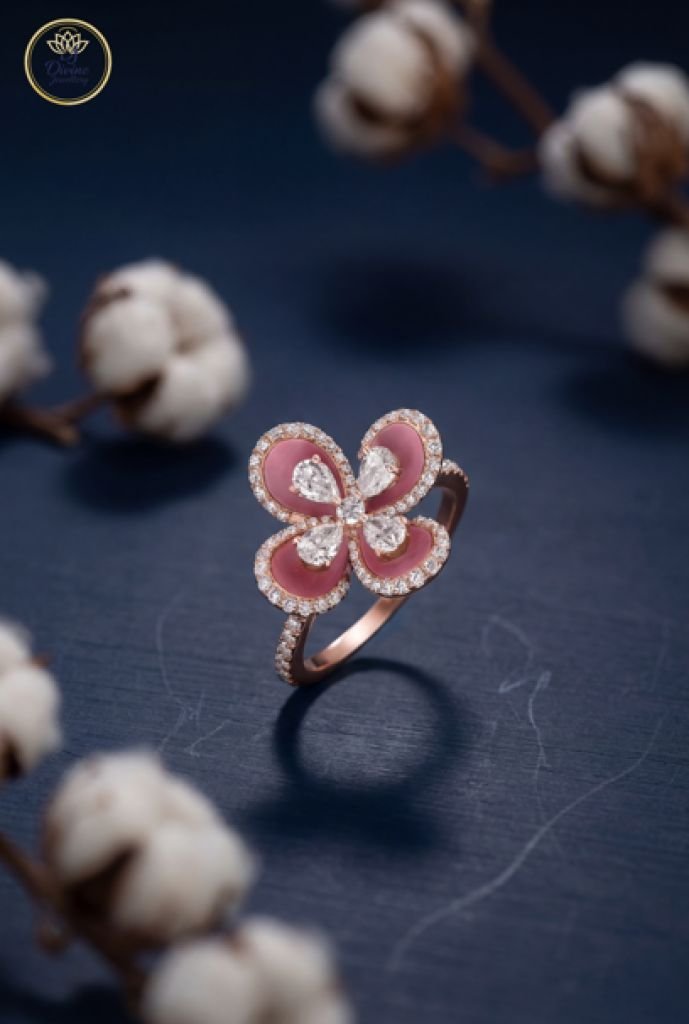 Divine Jewellery Pink Enamel Floral Crystal Designer Ring