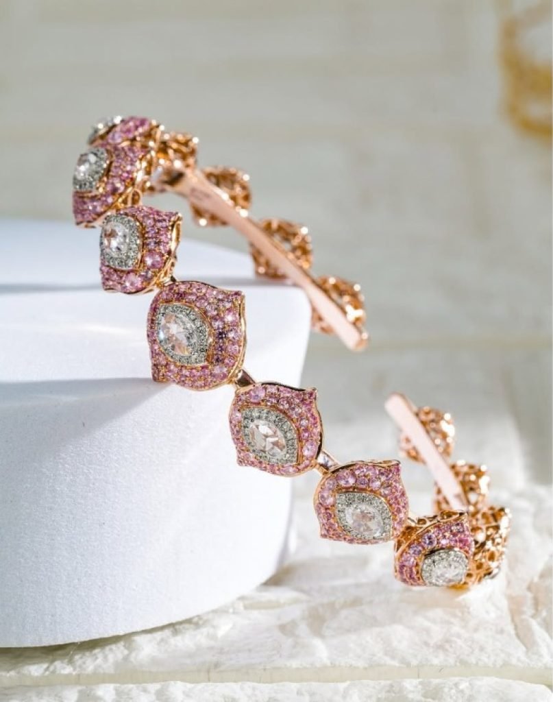 A luxurious rose gold bangle featuring pink pavé crystal halos surrounding brilliant center stones in an elegant linked design.