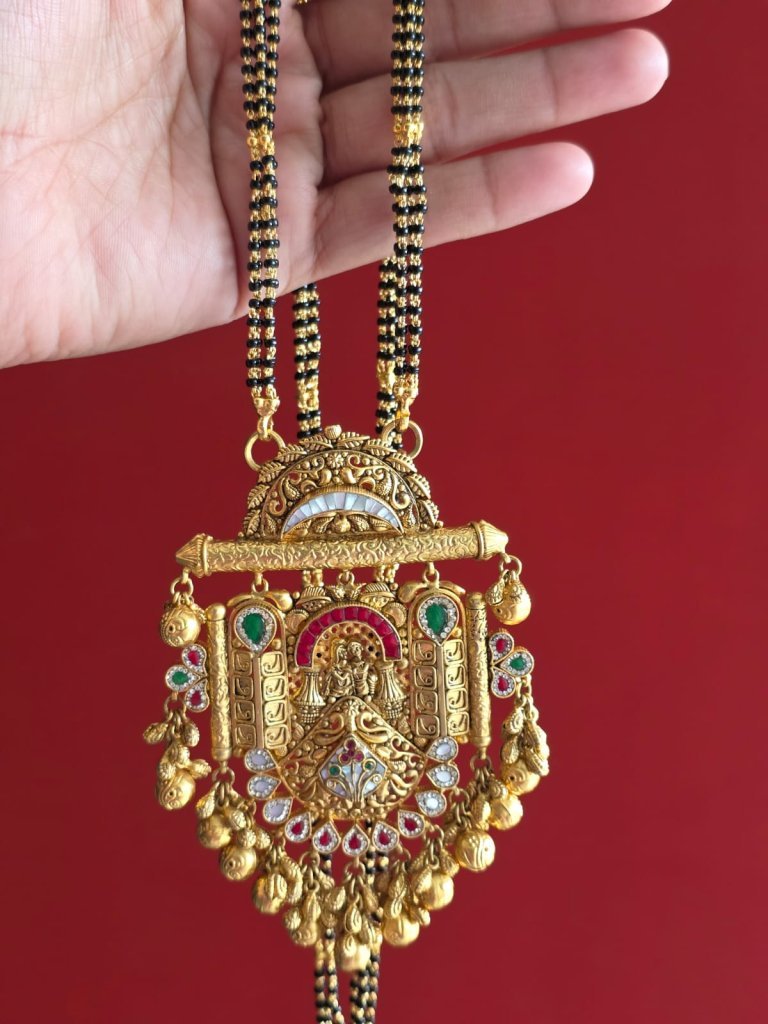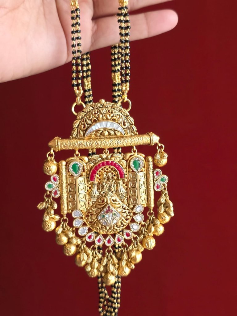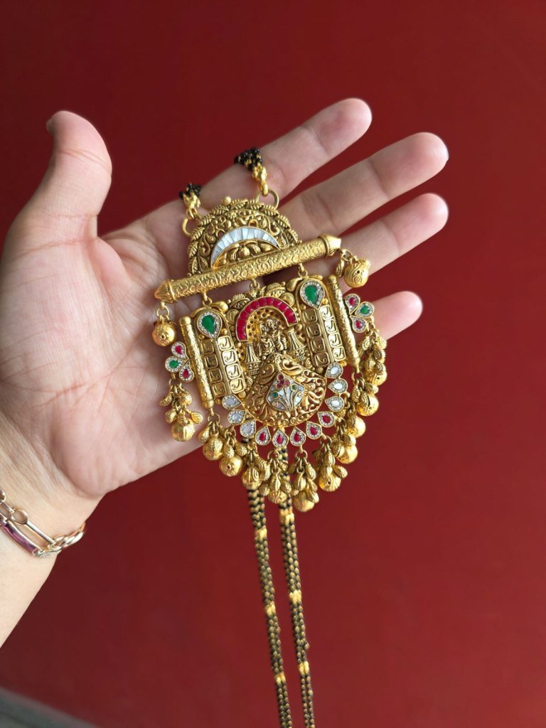 A majestic temple-inspired mangalsutra featuring intricate Lakshmi motif detailing with ruby and emerald accents.