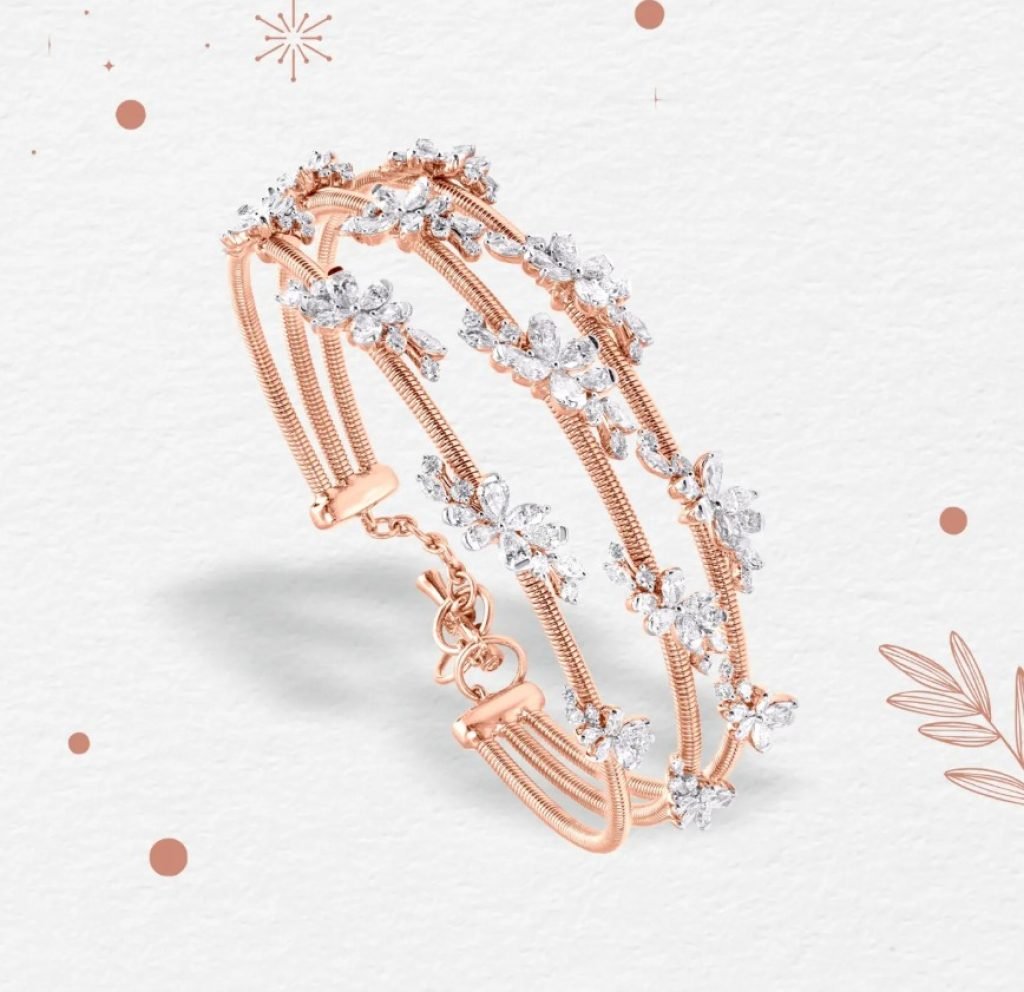 A stylish rose gold bracelet featuring delicate crystal flower motifs arranged across elegant multi-layer bands.