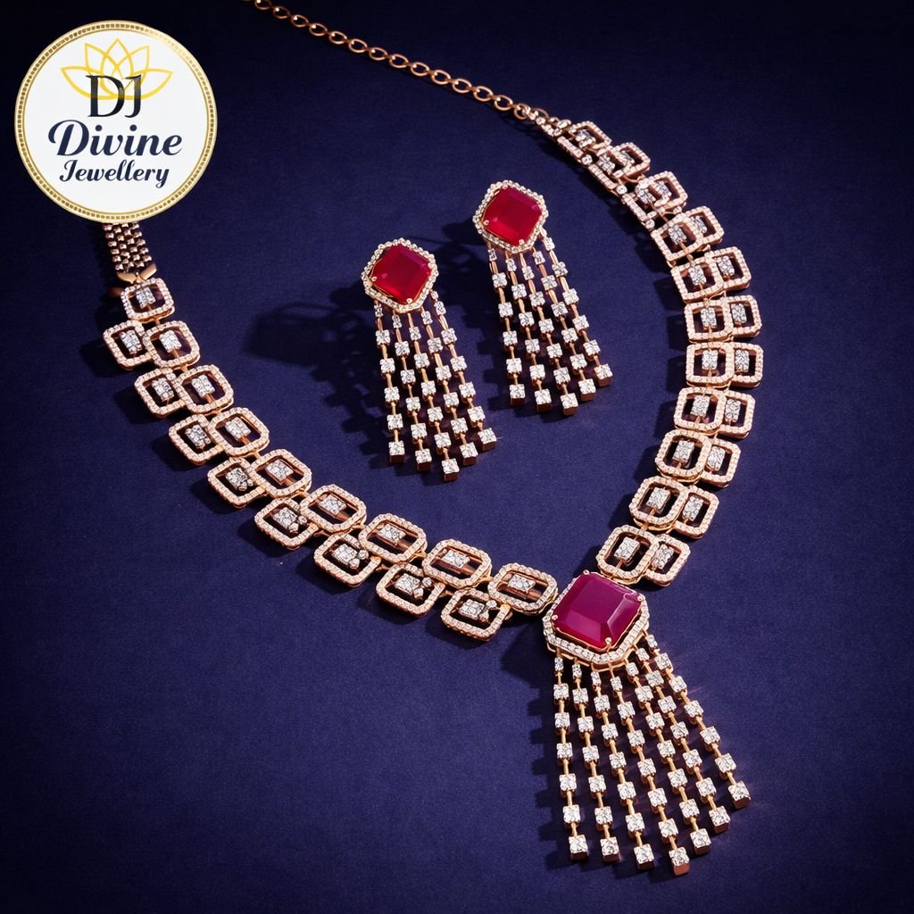 Divine Jewellery Rose Gold Ruby-Red Stone Designer Necklace Set with Tassel Drops