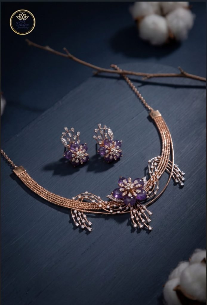 Divine Jewellery Royal Amethyst Bloom Rose Gold Collar Necklace Set with Crystal Tassel Detailing
