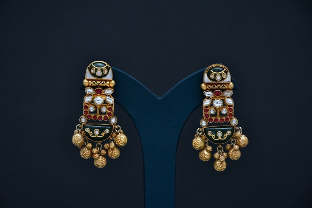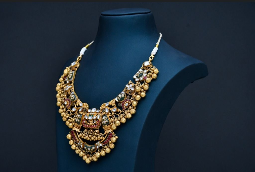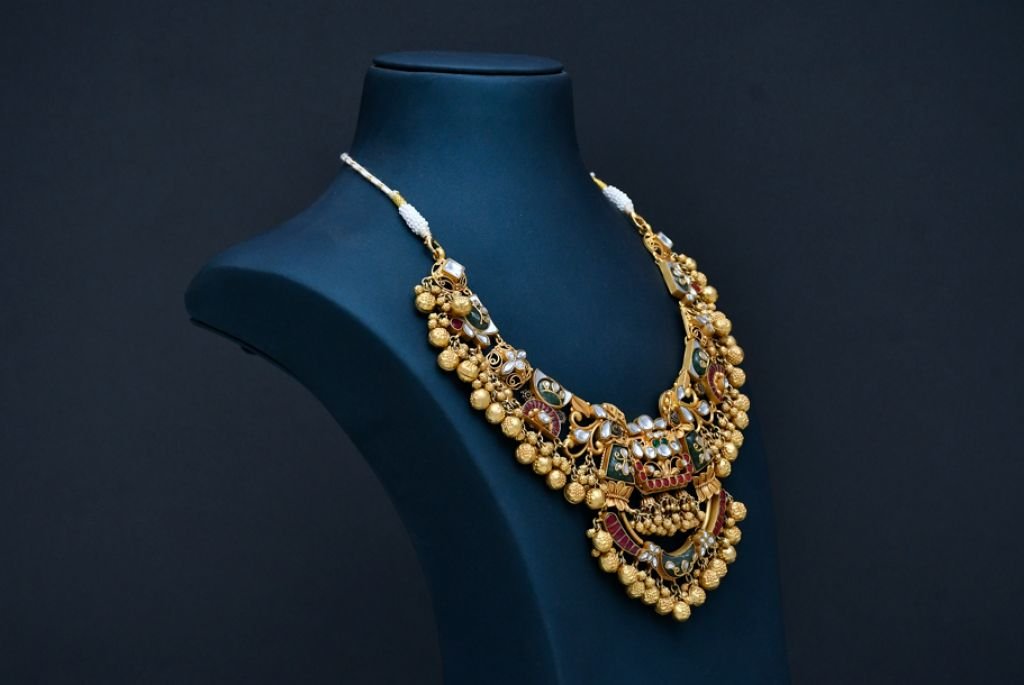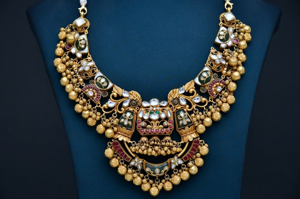 A grand temple-inspired necklace featuring intricate enamel panels, multicolor stone accents, and rich cascading gold bead layers.