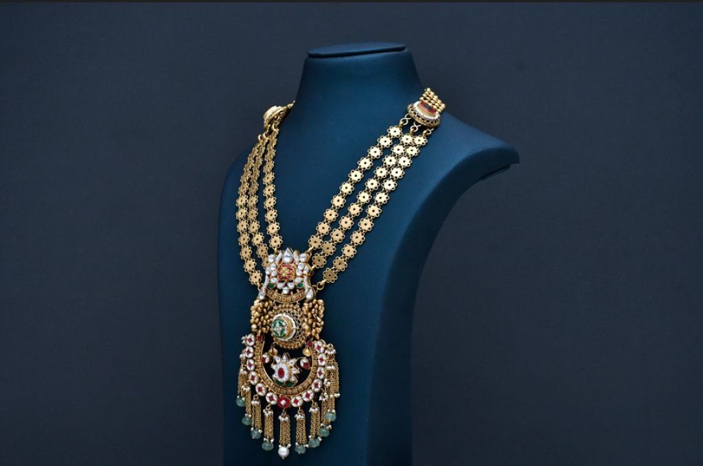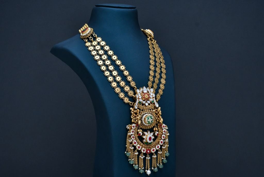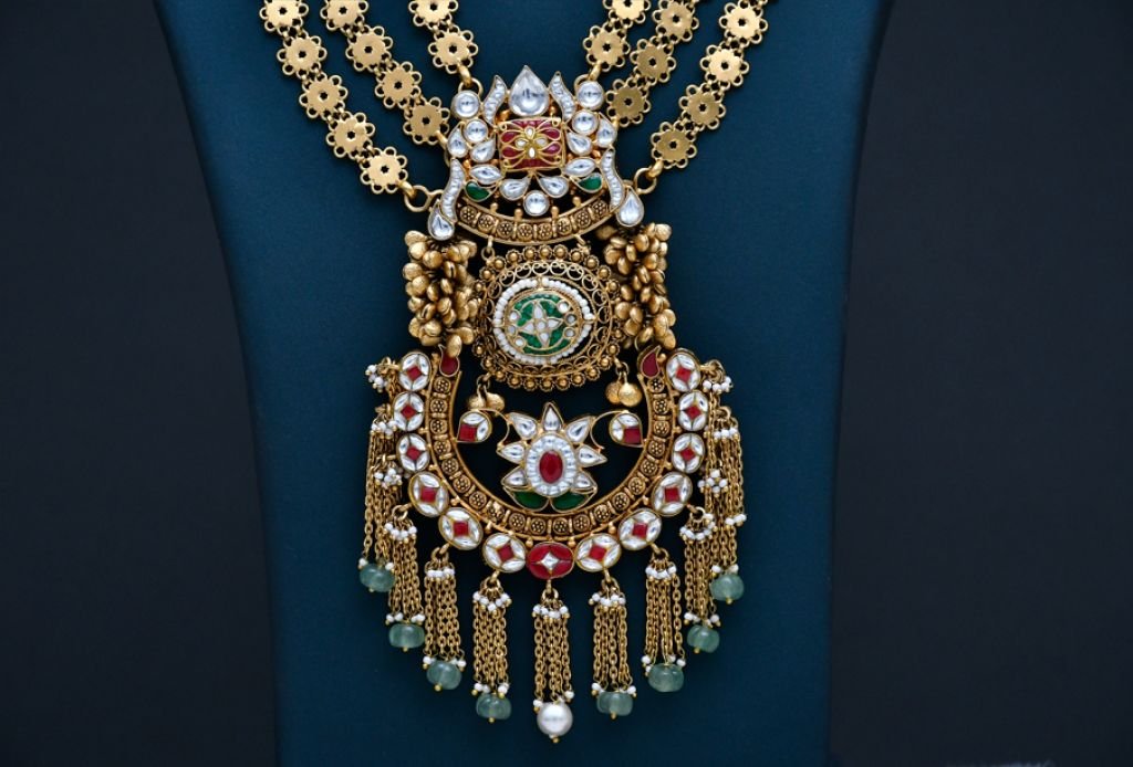 A majestic triple-layer floral chain necklace featuring a grand temple pendant with intricate carving and cascading bead detailing.