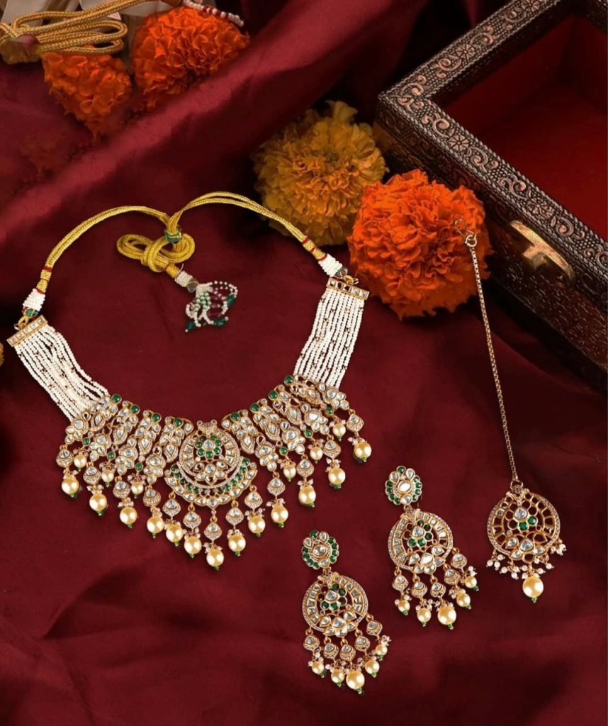 Divine Jewellery Royal Kundan Bridal Choker Set with Pearl Strands, Green Stones and Maang Tikka