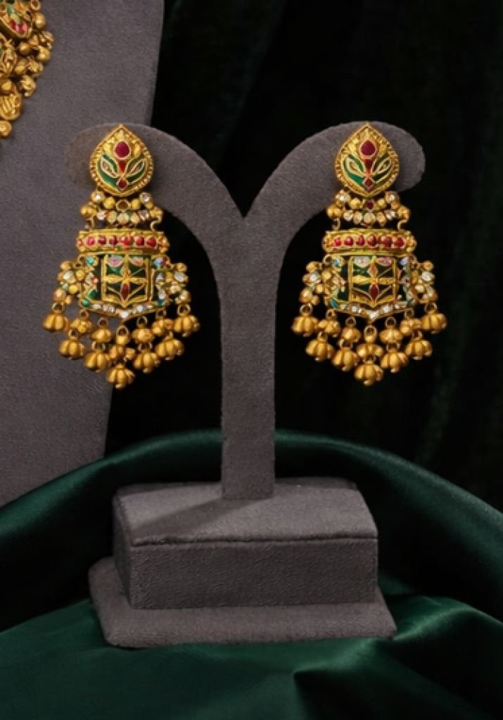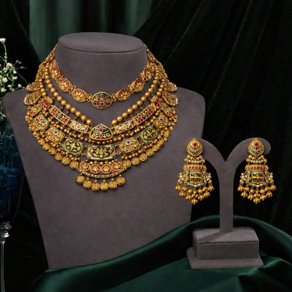 Divine Jewellery Royal Multilayer Temple 92.5 Silver Gold Plated Necklace Set with Meenakari Work and Jhumka Earrings