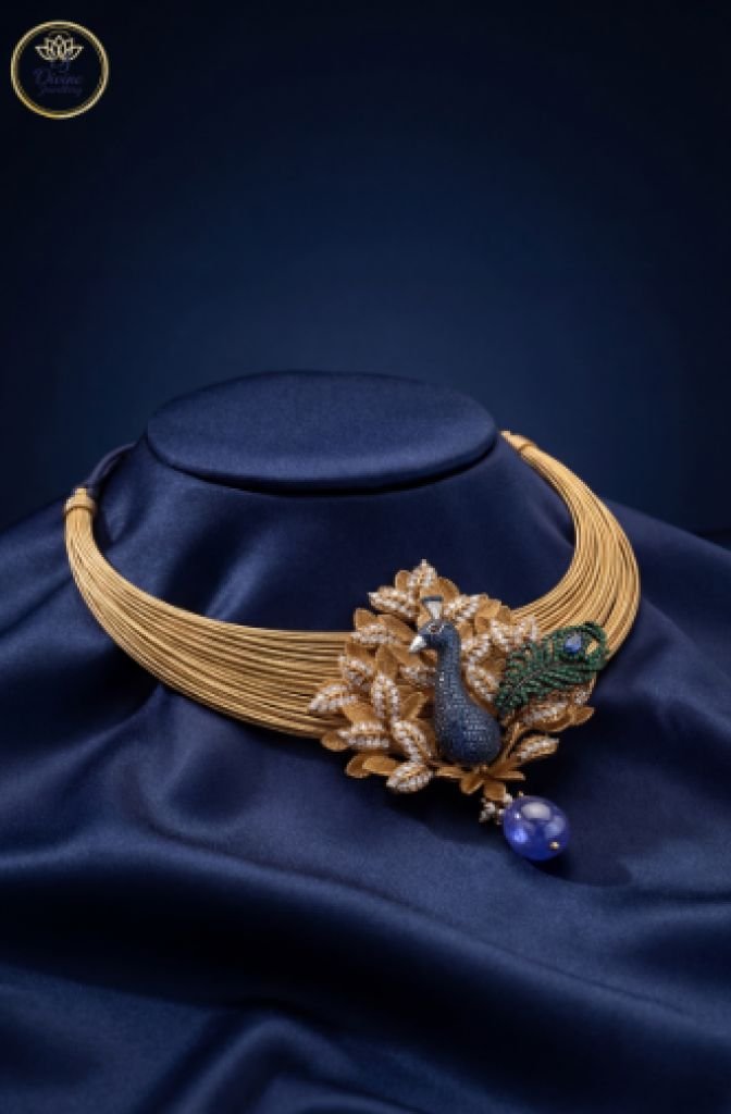 A magnificent multi-strand necklace featuring an artistic peacock centerpiece with gemstone detailing and royal craftsmanship.