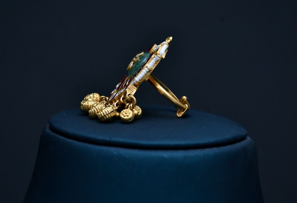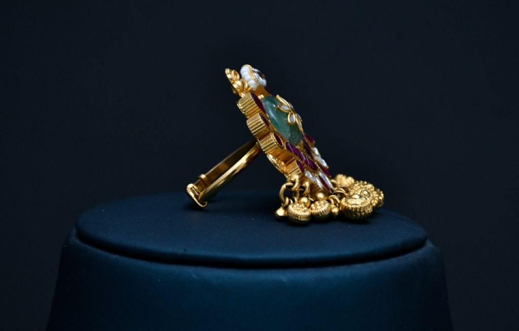 A grand temple-inspired ring featuring a peacock motif, vibrant stones, and traditional gold bead detailing.