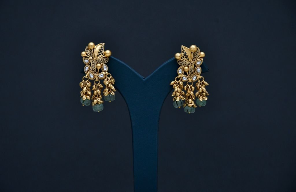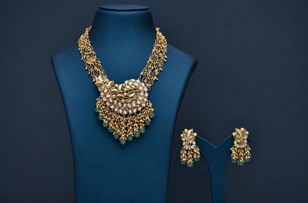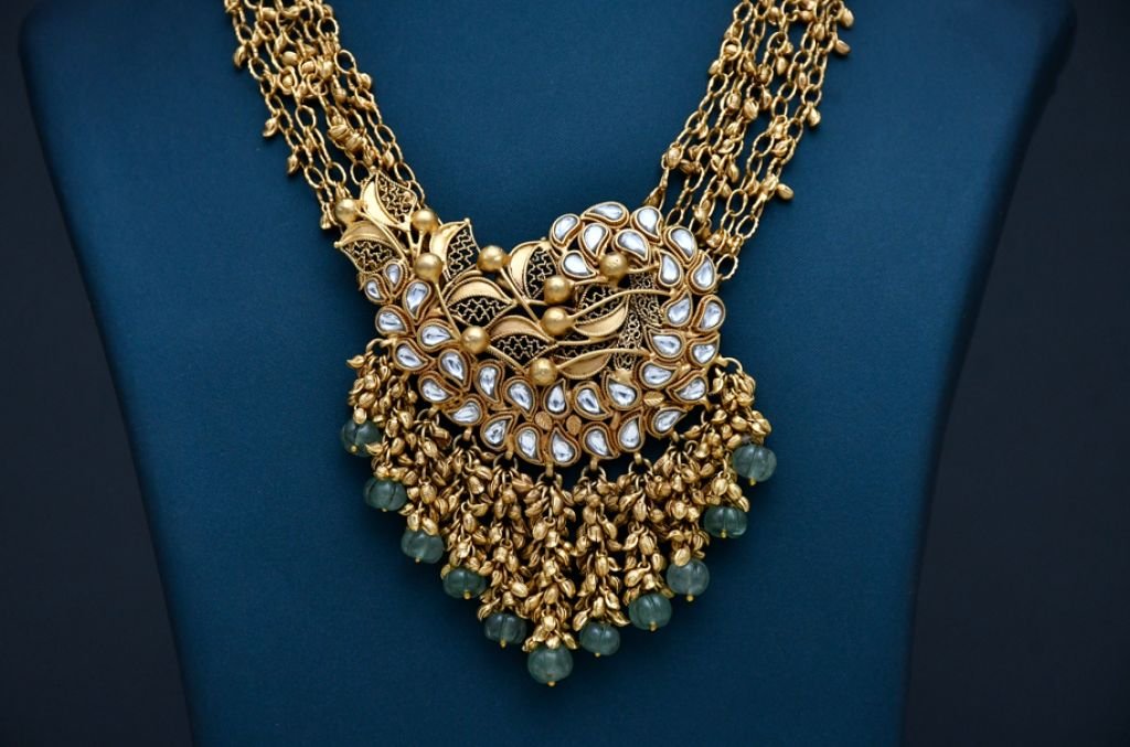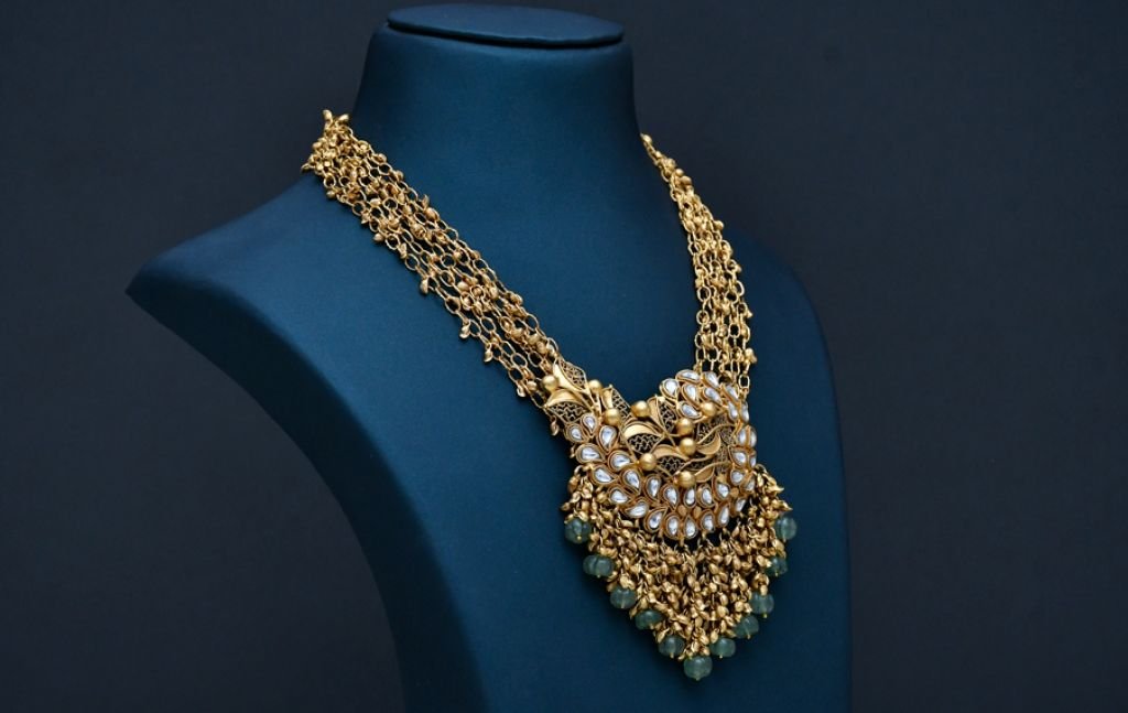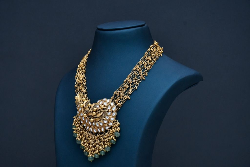 A regal multi-strand antique necklace featuring a peacock-inspired polki pendant and cascading green bead drops.