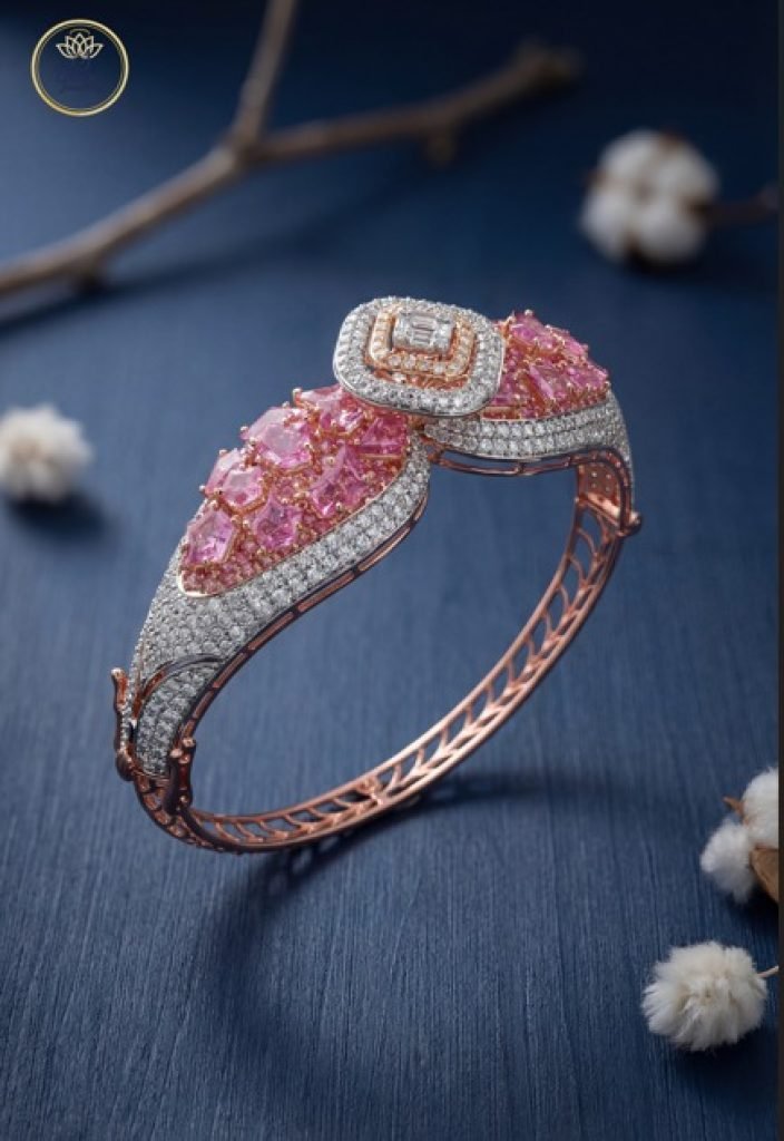A bold rose-gold bracelet featuring pink sapphire-inspired stones and layered diamond detailing for refined statement elegance.