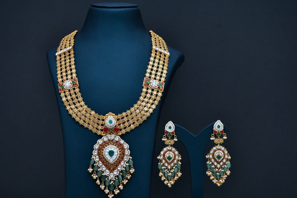 A majestic long bridal necklace featuring intricate filigree layers, polki-style detailing, ruby accents, and emerald drop embellishments.