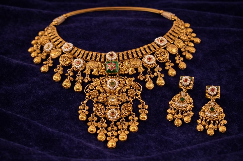 Grand temple choker with elephant design, meenakari detailing and rich coin hangings.