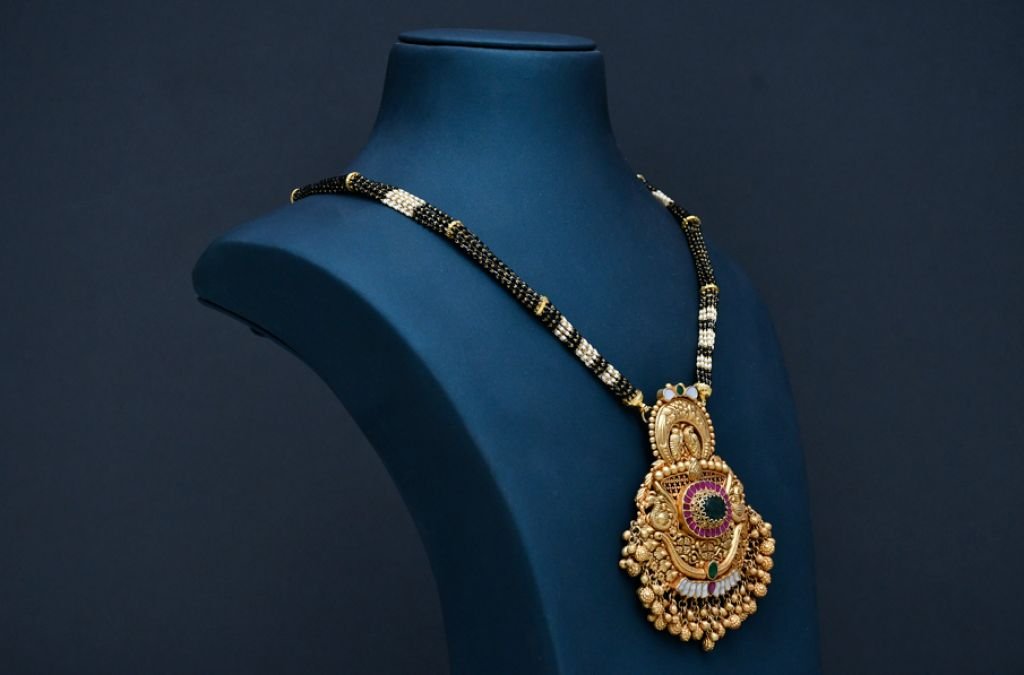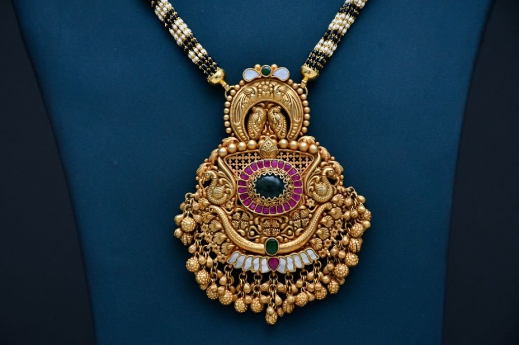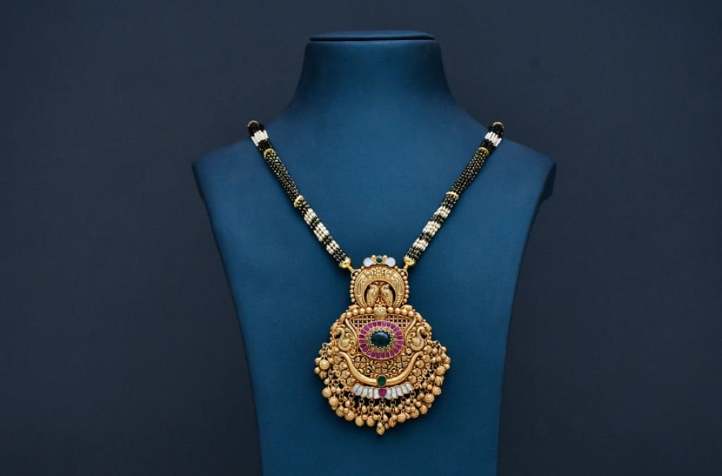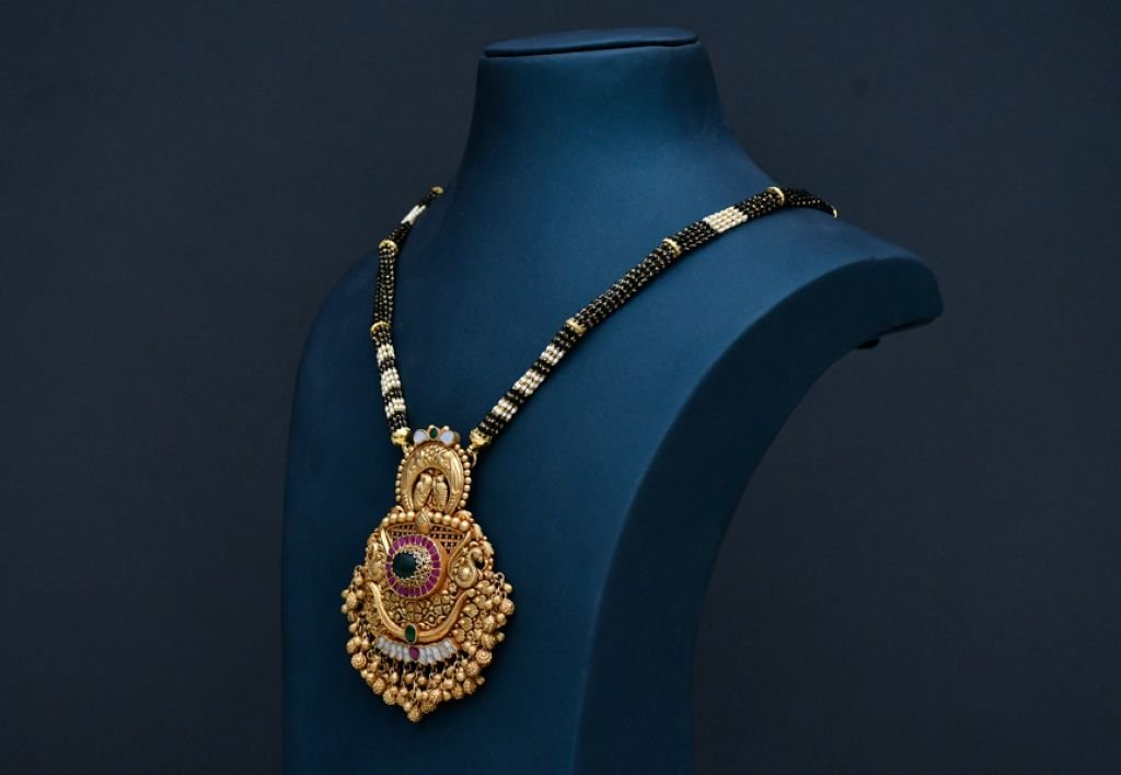 A majestic temple-style mangalsutra featuring black bead strands and a grand Lakshmi-inspired antique pendant.