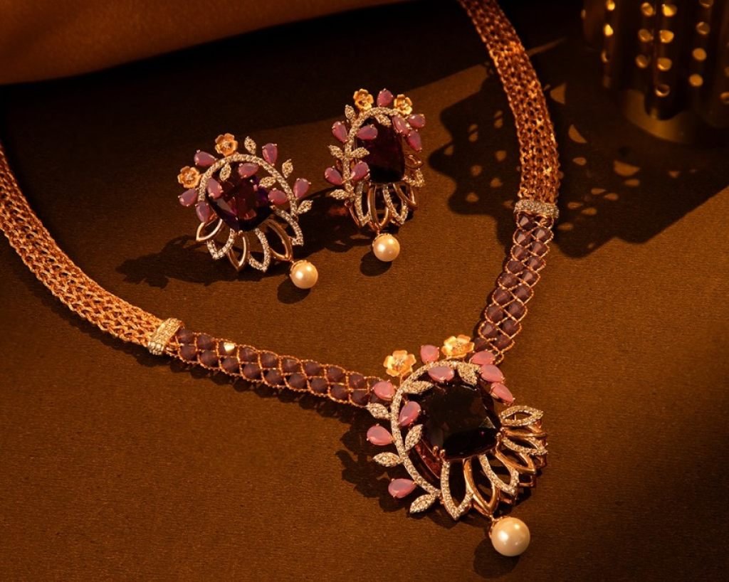 Divine Jewellery Ruby Crystal Floral Designer Necklace Set with Pearl Drop Earrings