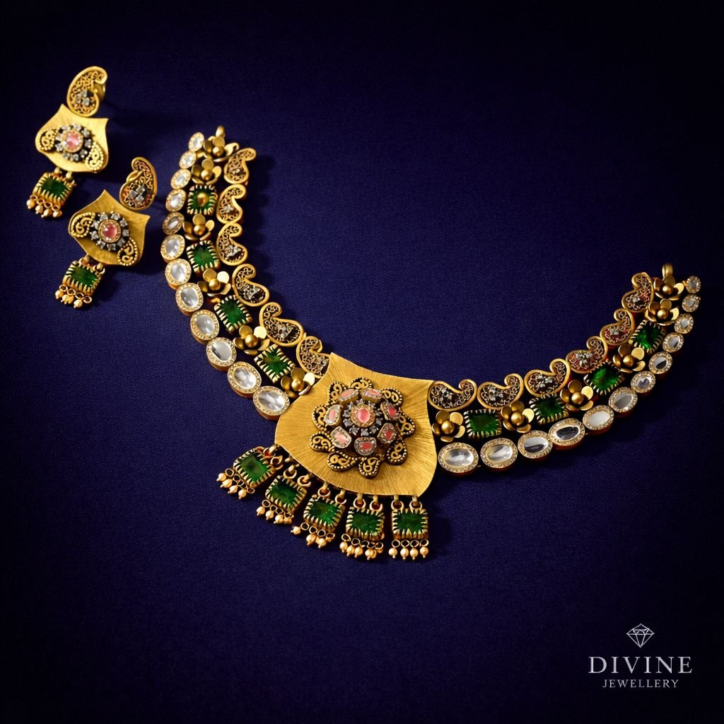 Divine Jewellery Silver Gold Plated Antique Temple Necklace Set with Kundan, Green Stones & Pearl Accents