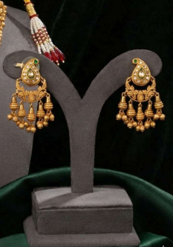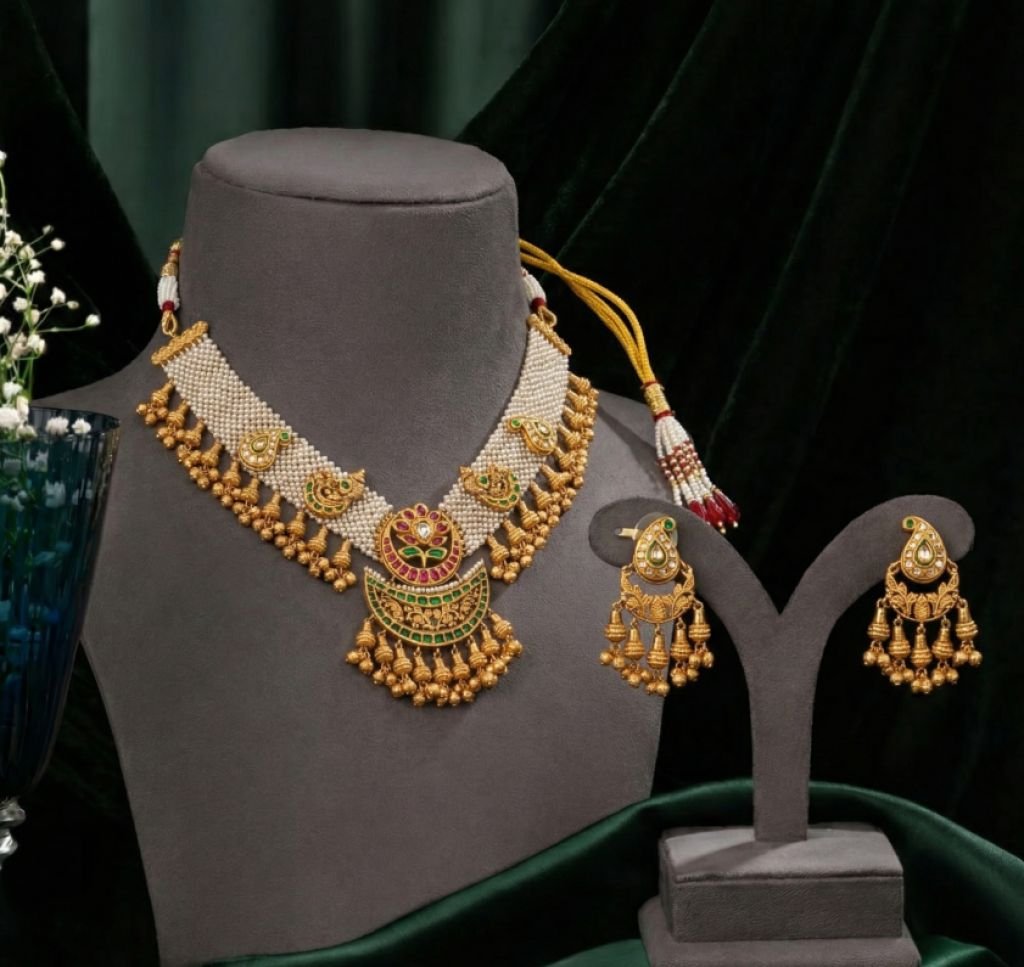 Elegant pearl choker necklace set crafted in 92.5 silver with gold plating, featuring temple-style pendant detailing and matching jhumka earrings. Perfect for weddings and festive wear.