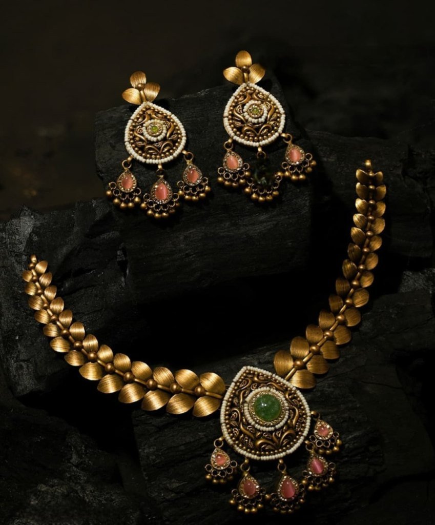 Elegant gold-plated 92.5 silver temple-style necklace set featuring antique leaf motifs, a green centerpiece stone, and coral drop charms with matching earrings.