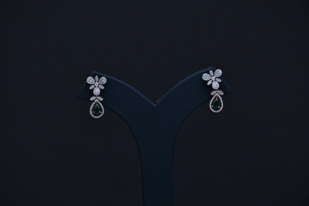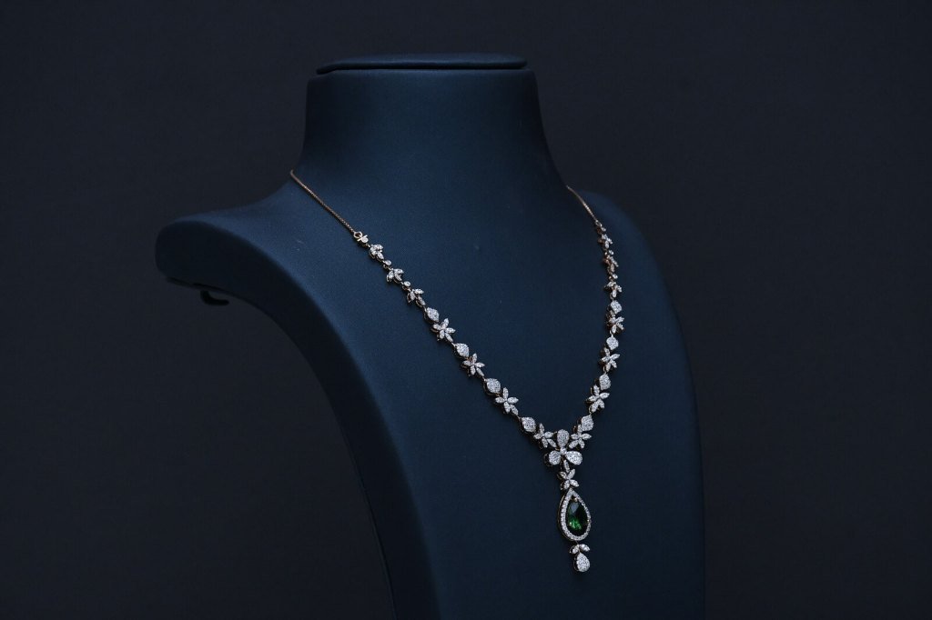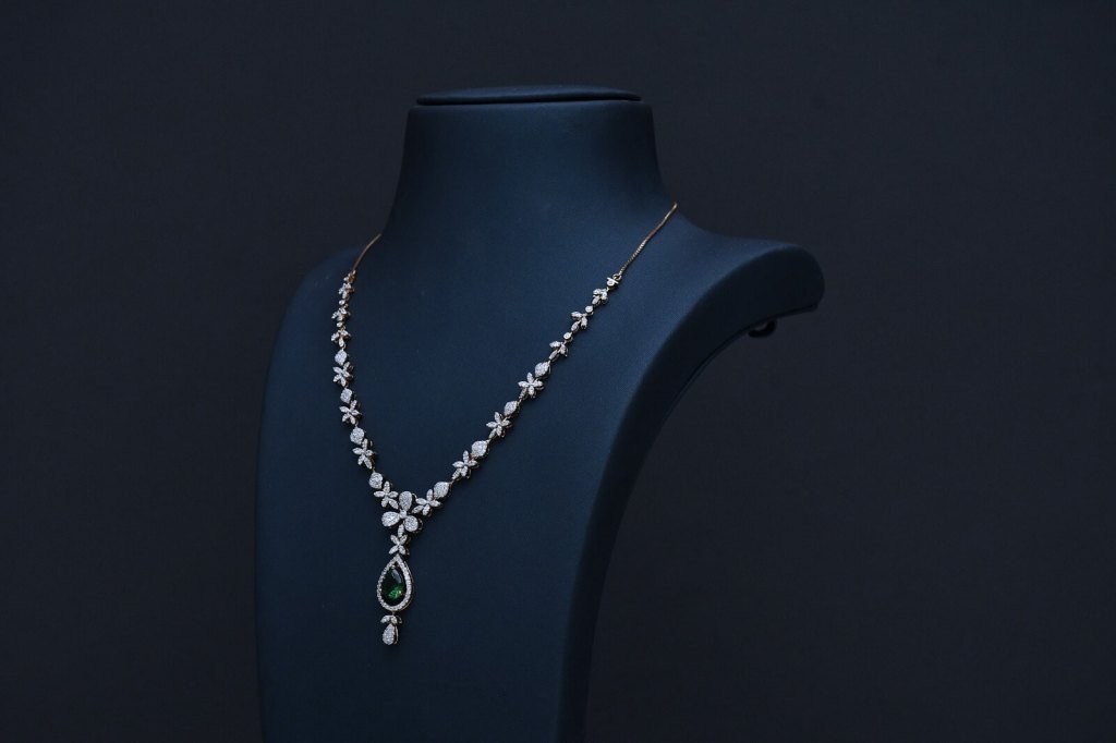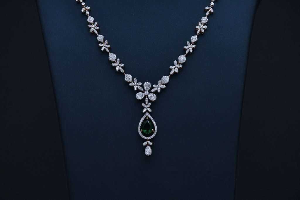 timeless grace to your jewellery collection with the Divine Royal Emerald Drop Diamond Necklace Set, a masterpiece designed for women who love elegance with a royal touch. This stunning Divine necklace features a delicate floral pattern flowing gracefully along the neckline, highlighted with sparkling diamond-like stones that reflect light beautifully.