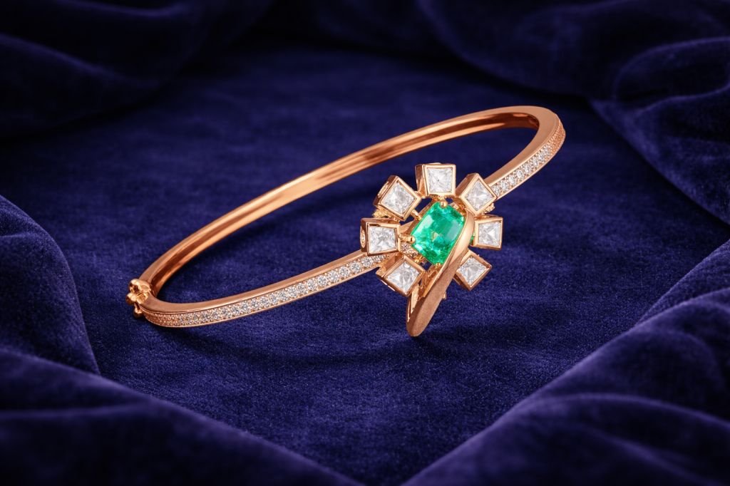 A stunning rose gold plated bracelet featuring an emerald center stone with a floral diamond-studded design—crafted in 92.5 silver for modern elegance.