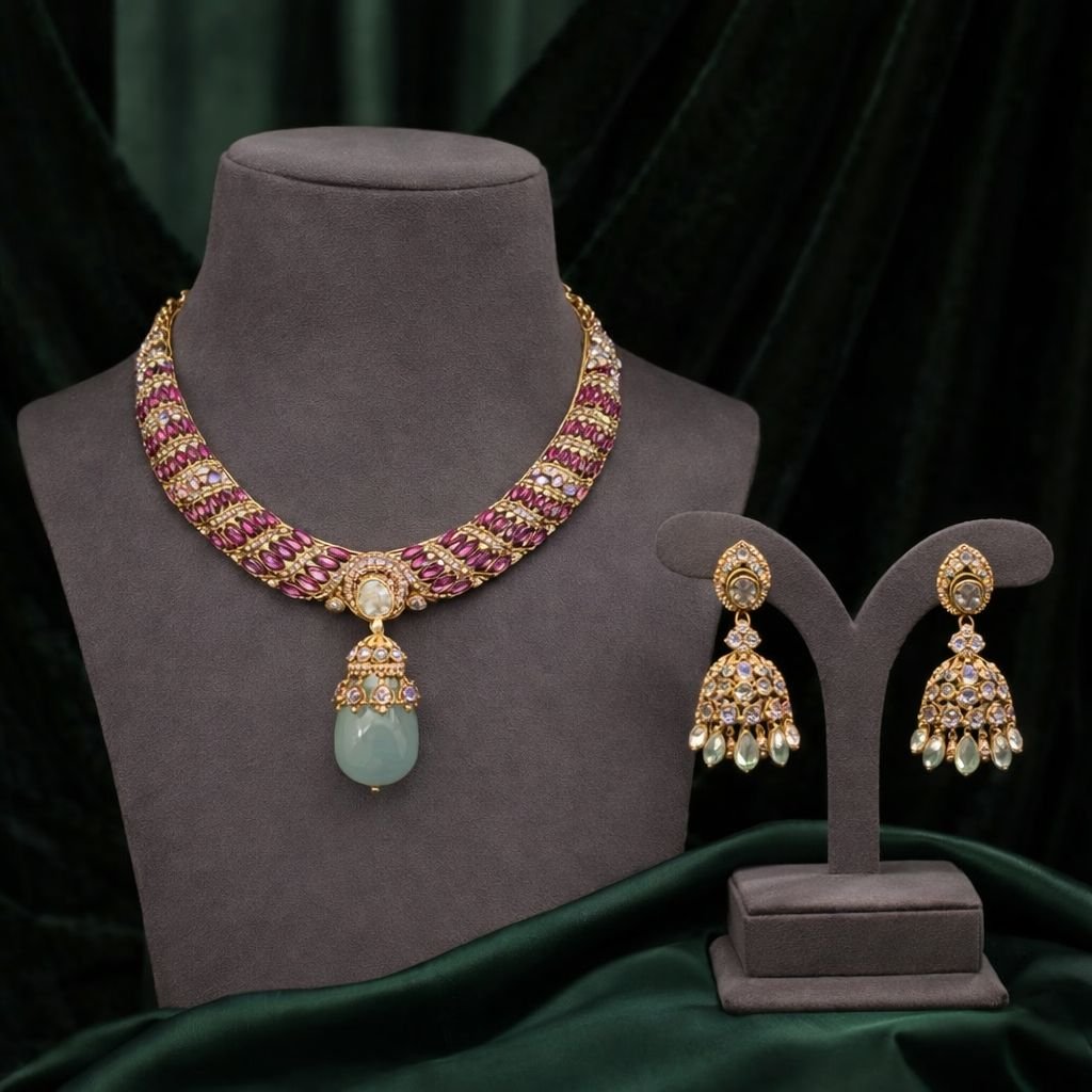 Elegant Pink Stone Choker Necklace Set with Kundan & Drop Pendant – 92.5 Silver Gold Plated Jewellery | Divine Jewellery