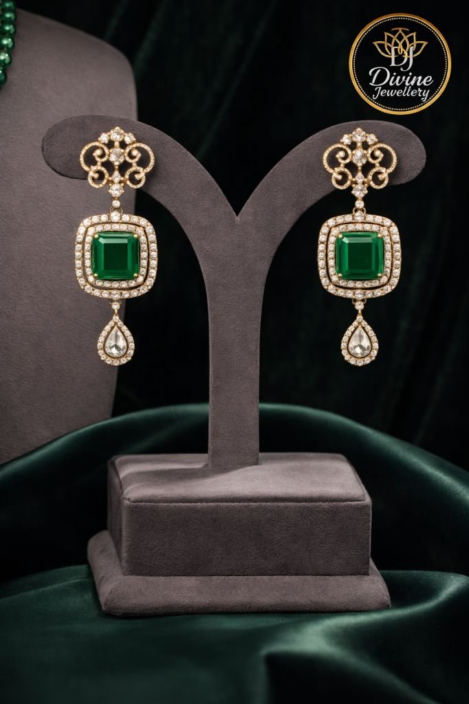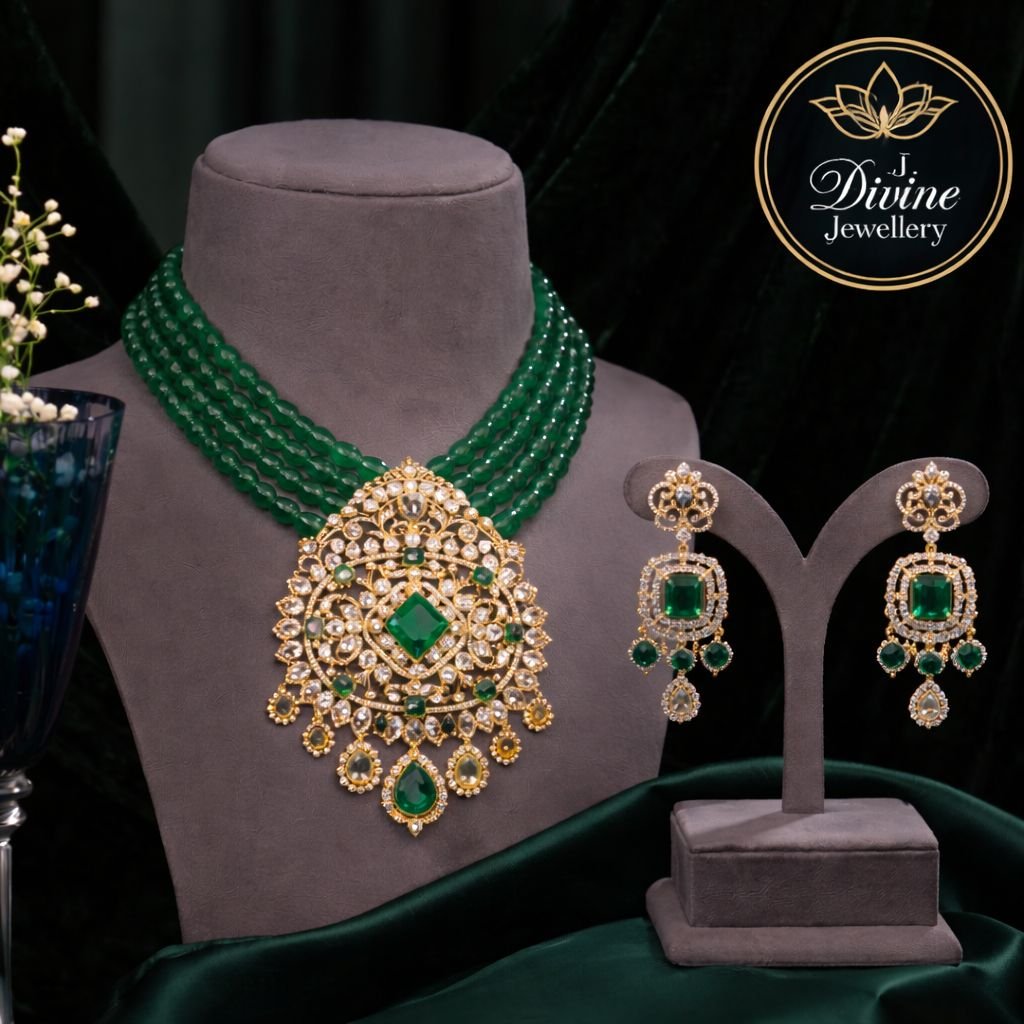 Emerald Beaded Kundan Necklace Set with Grand Statement Pendant & Designer Earrings – 92.5 Silver Gold Plated