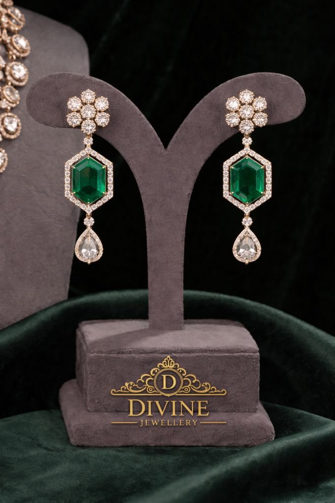 A stunning layered necklace set featuring sparkling diamond-style stones with a bold emerald centerpiece, crafted in 92.5 silver with elegant rose gold plating. Perfect for bridal and luxury occasions.