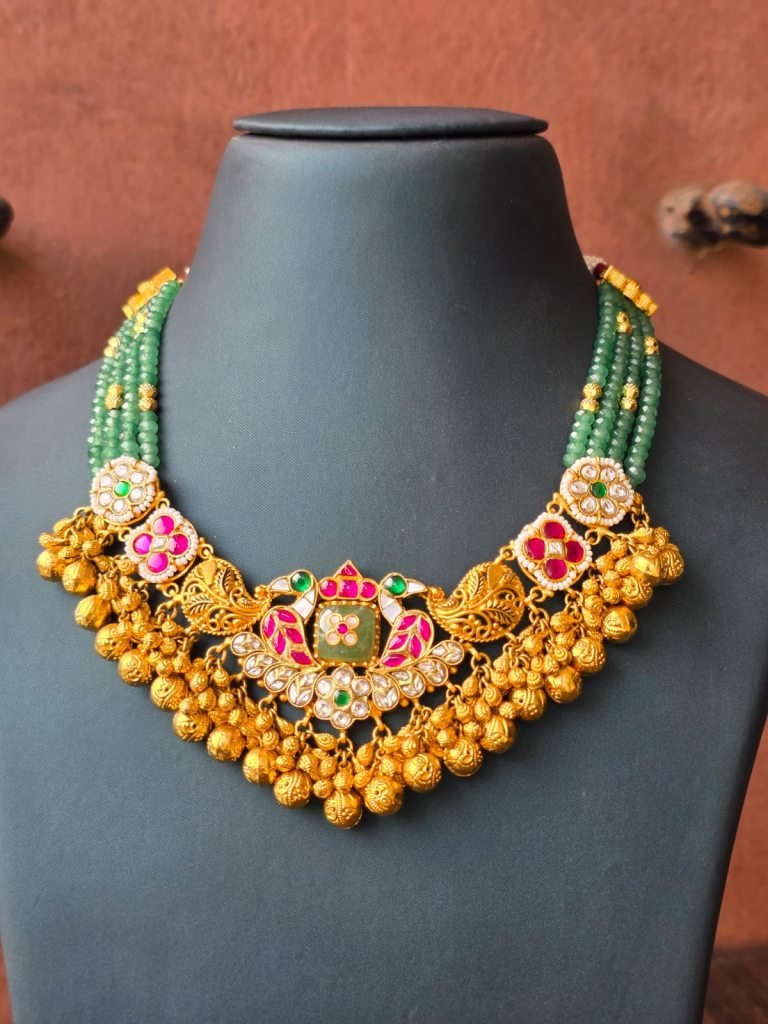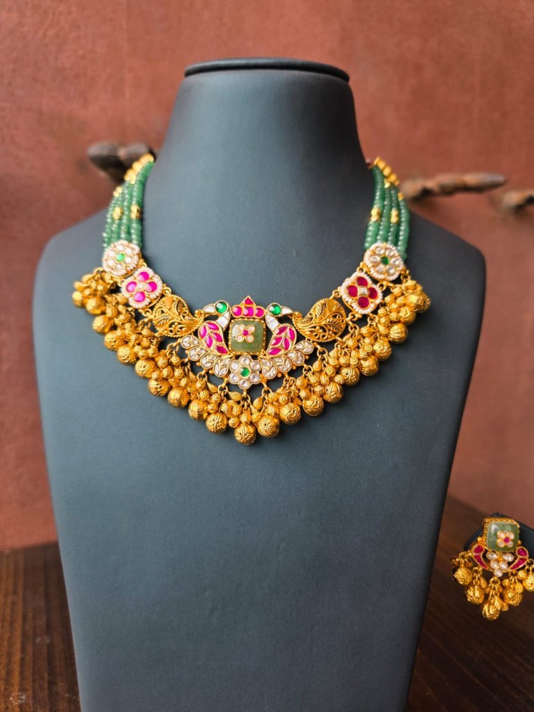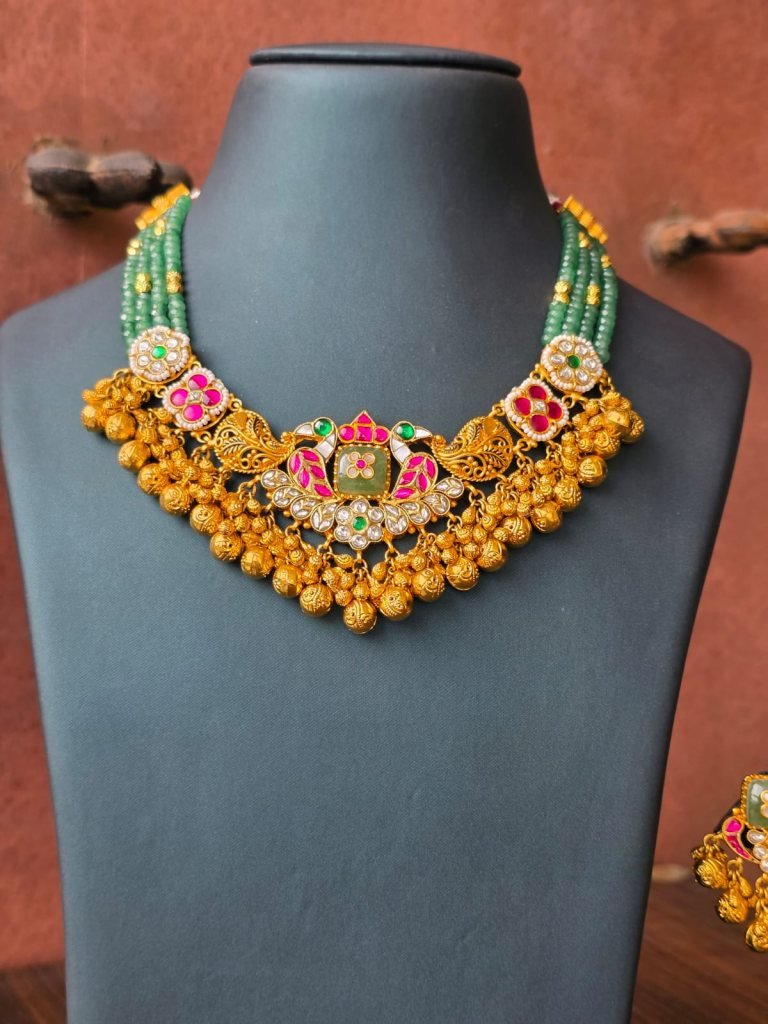 Emerald Pushpa Antique Beaded Temple Necklace Set with Gold Ghungroo Drops