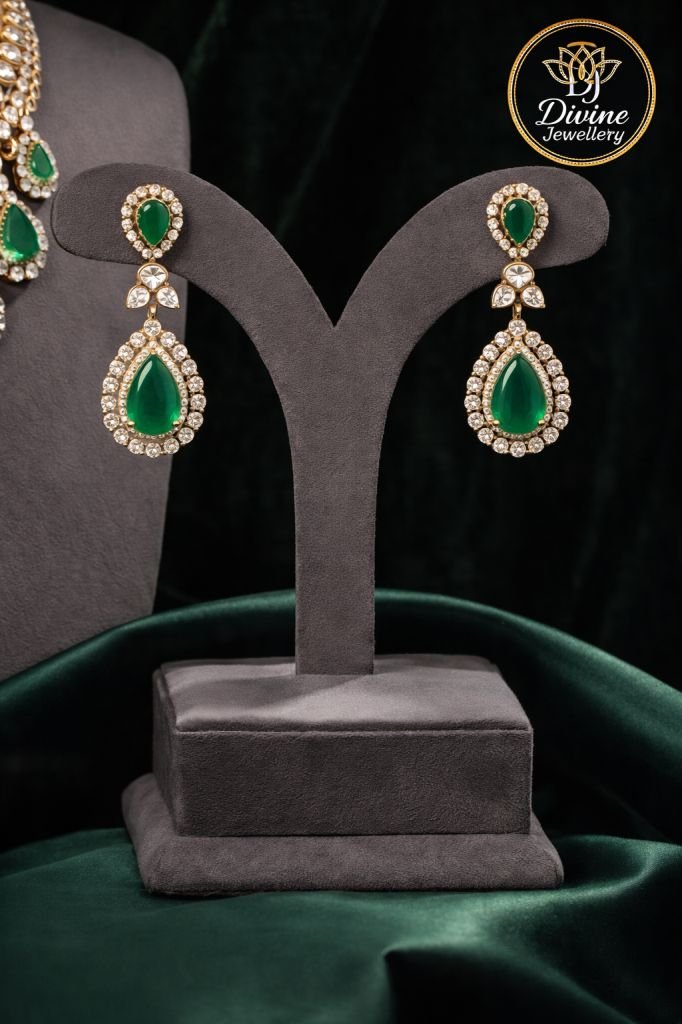 Emerald Teardrop Kundan Necklace Set with Layered Detailing & Matching Earrings – 92.5 Silver Gold Plated
