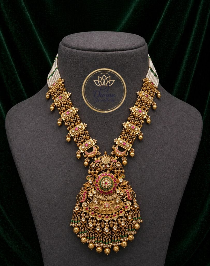 Heavy bridal long haram with intricate temple pendant, multicolor stones, and layered hanging beads.