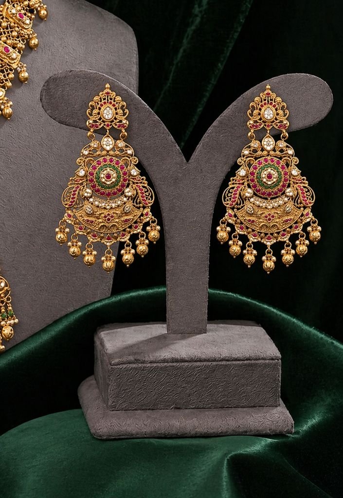Grand Bridal Long Haram Necklace Set with Temple Pendant & Multicolor Stone Work – 92.5 Silver Gold Plated